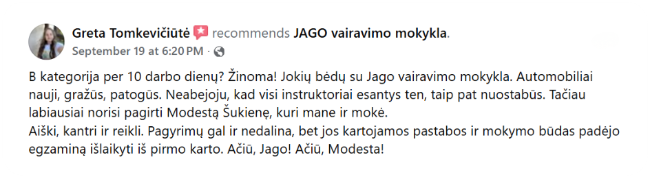 Tik patys geriausi atsiliepimai! Labai dėkinga visai JAGO komandai už profesionalią pagalbą. Instruktoriai tikri savo srities specialistai, o automobiliai tokie patys, kaip ir Regitroje. Labai nuoširdžiai rekomenduoju!